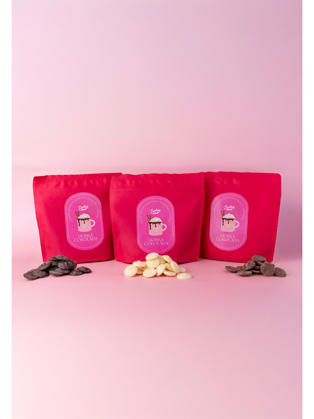 Roztomilý růžový sáček, ve které se ukrývá lahodná horká čokoláda. Dokonalá, sametová a navíc plná prémiové belgické čokolády.
