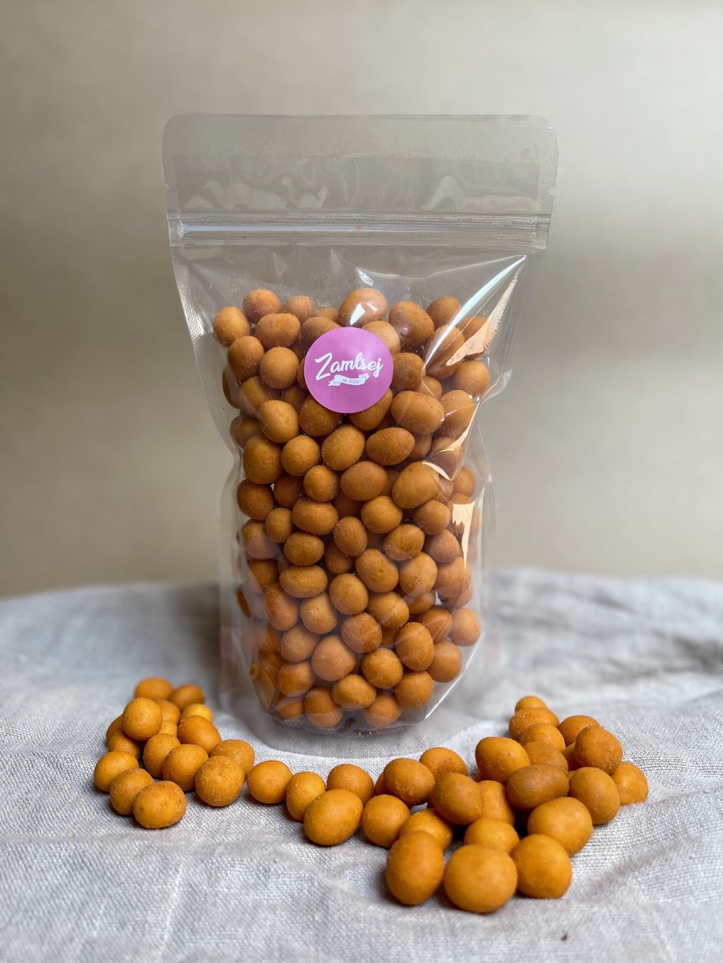 Složení: arašídy 36%, pšeničná mouka, cukr, modifikovaný kukřičný škrob, slunečnicový olej, mořská sůl, koření ( regulátor kyselosti: kyselina octová, E262, kyselina jablečná, citronová, mléčná, cukr, maltodextrin, sůl, aroma, extrakt z kvasnic, česnekový, cibulový prášek, chilli paprička, bazalka, zázvor, kmín, zvýrazňovač chuti E635), kypřící prostředek E 503, barvivo: paprikový extrakt