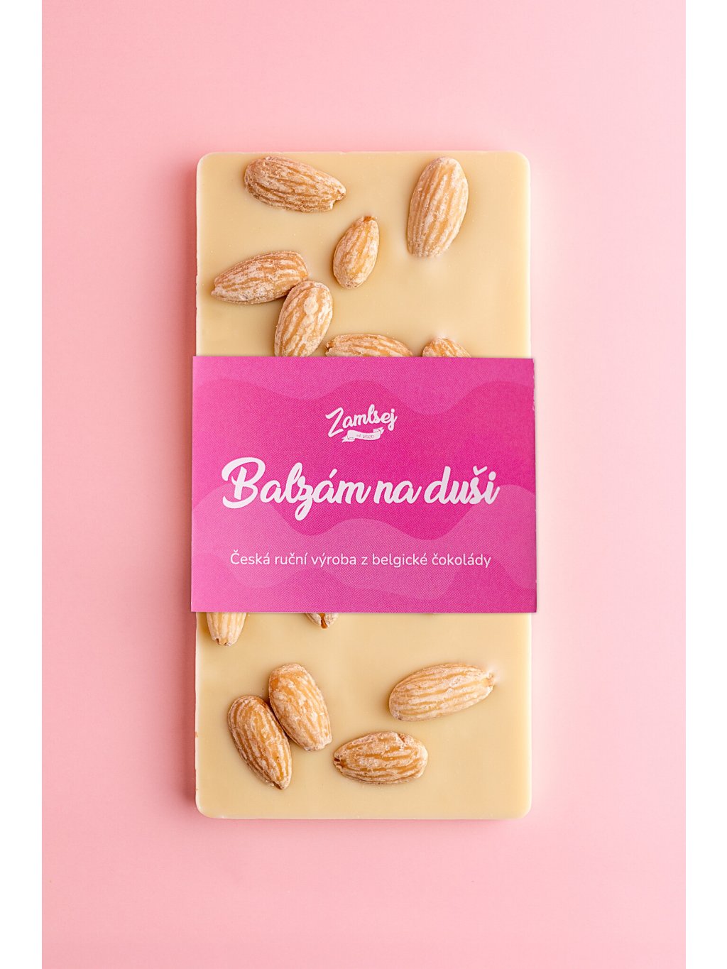 Složení: Bílá čokoláda 40 % hm. (cukr, kakaové máslo, sušené plnotučné mléko, emulgátor: sójový lecitin, přírodní vanilkové aroma), slané mandle.