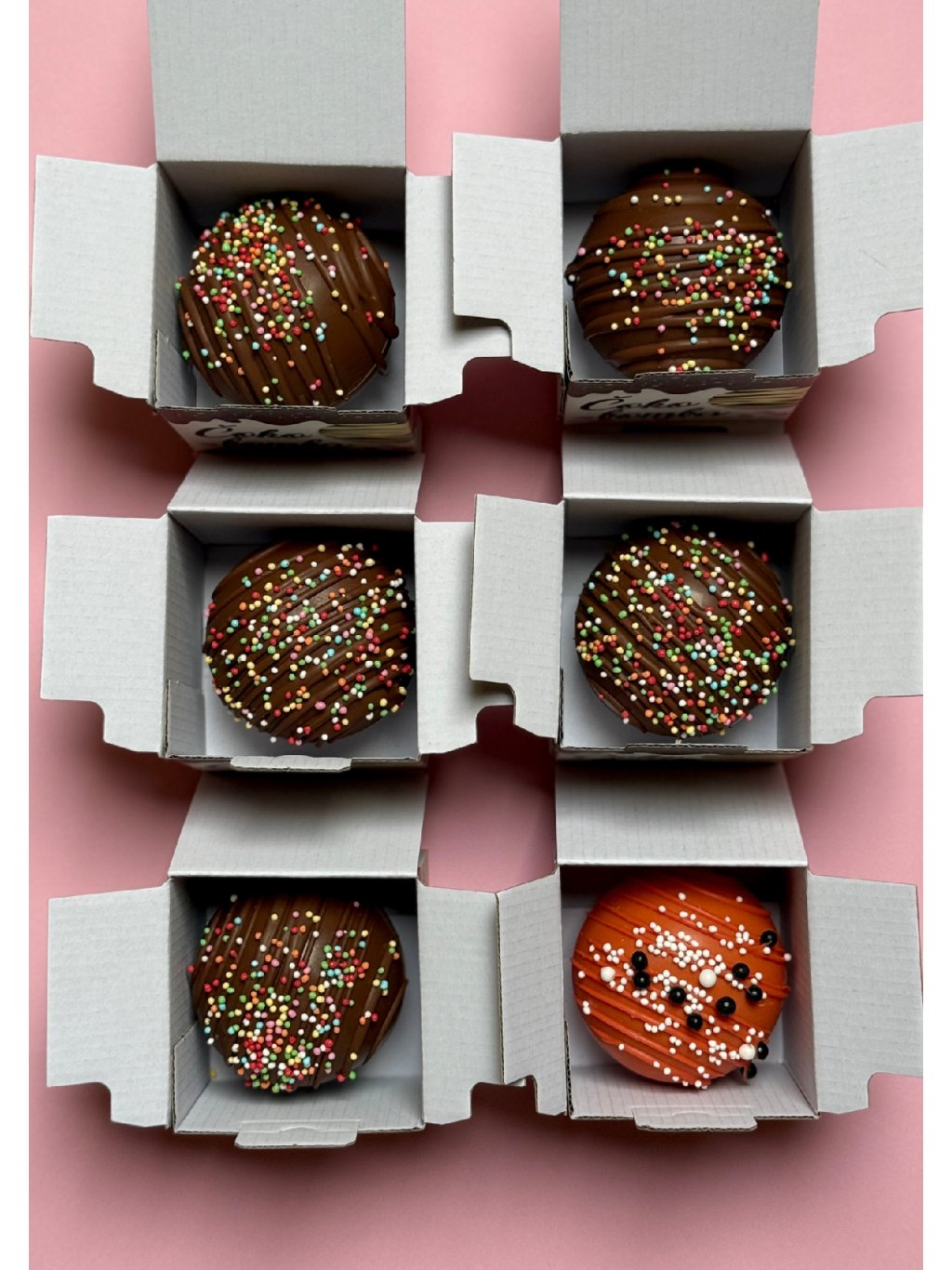 6 x 1 ks čokoládová bomba, zabalená v celofánovém sáčku a následně uložená v nádherné dárkové krabičce. Součástí krabičky je i návod na následnou přípravu horké čokolády.