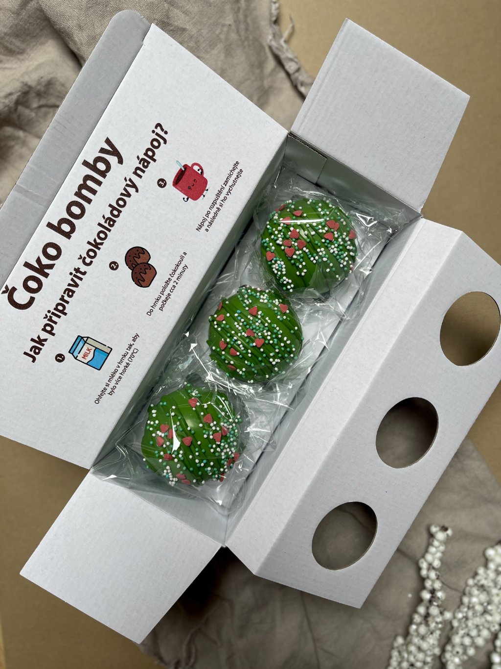 1 ks / 3 ks / 6 ks čokoládová bomba z bílé čokolády, zabalená v celofánovém sáčku a následně uložená v nádherné dárkové krabičce. Součástí krabičky je i návod na následnou přípravu horké čokolády.