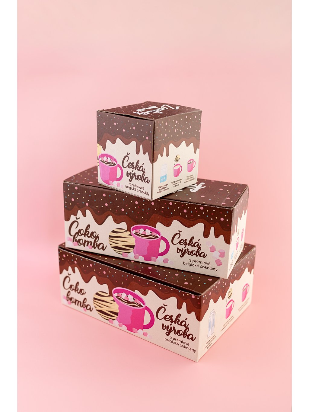 1 ks / 3 ks / 6 ks čokoládová bomba z bílé čokolády, zabalená v celofánovém sáčku a následně uložená v nádherné dárkové krabičce. Součástí krabičky je i návod na následnou přípravu horké čokolády.