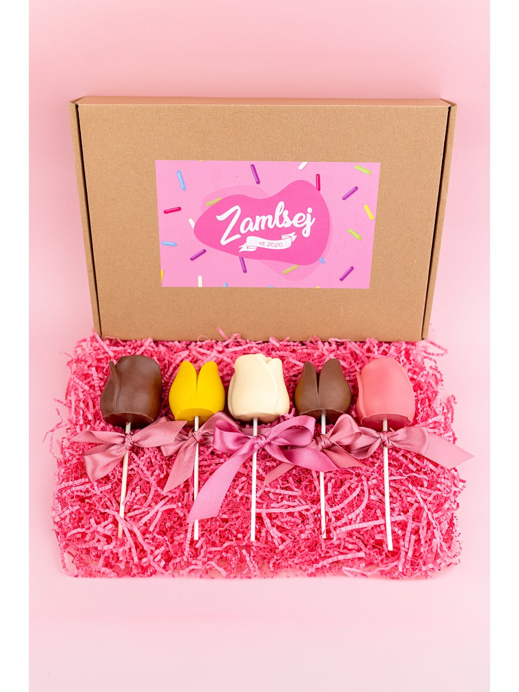 Žlutý tulipán s bílým krémem: Bílá čokoláda 40 % hm. (cukr, kakaové máslo, sušené plnotučné mléko, emulgátor: sójový lecitin, přírodní vanilkové aroma), barvivo: E102*, krém: rostlinné tuky, cukr, plnotučné sušené mléko, bílá čokoláda 10 % (cukr, kakaové máslo, plnotučné sušené mléko), laktóza, syrovátkový protein, emulgátor: sojový lecitin, aromata.