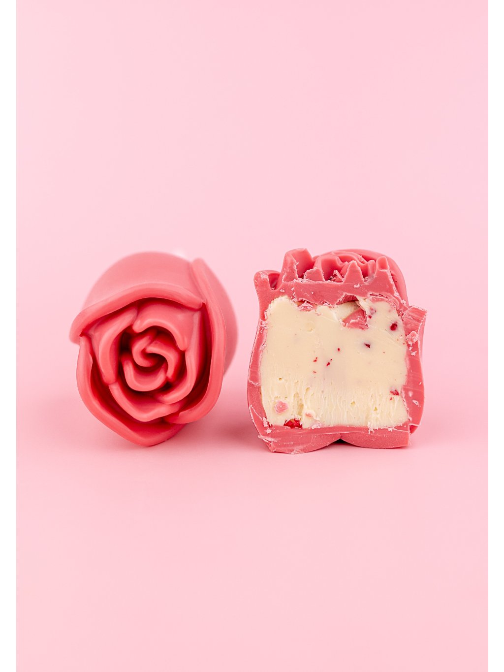 Růžová růže s krémem z růže: Bílá čokoláda 40 % hm. (cukr, kakaové máslo, sušené plnotučné mléko, emulgátor: sójový lecitin, přírodní vanilkové aroma), krém: rostlinné oleje, odtučněné mléko v prášku, cukr, maltodextrin, lyofilizované maliny (cukr, maliny, škrob, koncentrovaná malinová šťáva), bílá čokoláda (cukr, kakaové máslo, mléko v prášku, syrovátka v prášku, emulgátor: sójový lecitin E322, vanilkový extrakt), emulgátor: sójový lecitin, kakaové máslo, aromata (včetně růžového aroma), antioxidant: E306, sůl.