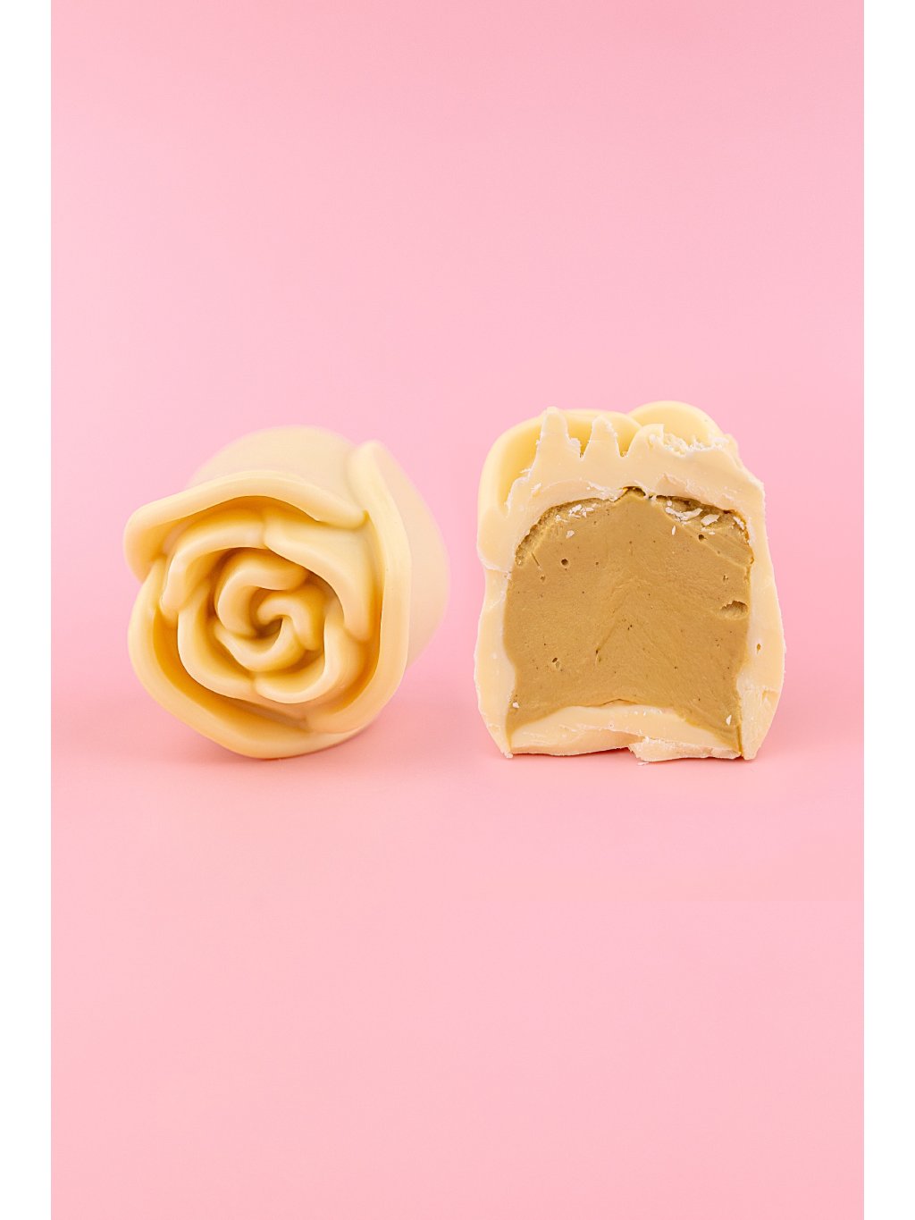 Růžová růže s krémem z růže: Bílá čokoláda 40 % hm. (cukr, kakaové máslo, sušené plnotučné mléko, emulgátor: sójový lecitin, přírodní vanilkové aroma), krém: rostlinné oleje, odtučněné mléko v prášku, cukr, maltodextrin, lyofilizované maliny (cukr, maliny, škrob, koncentrovaná malinová šťáva), bílá čokoláda (cukr, kakaové máslo, mléko v prášku, syrovátka v prášku, emulgátor: sójový lecitin E322, vanilkový extrakt), emulgátor: sójový lecitin, kakaové máslo, aromata (včetně růžového aroma), antioxidant: E306, sůl.