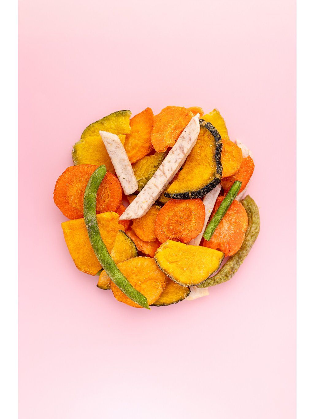 Složení: Složení: sladké brambory 29,2%, cuketa 20,9%, taro 12,5%, mrkev 12,5%, palmový olej 12%, zelené fazolky 8,4%, dextrin 4% sůl 0,5%.
