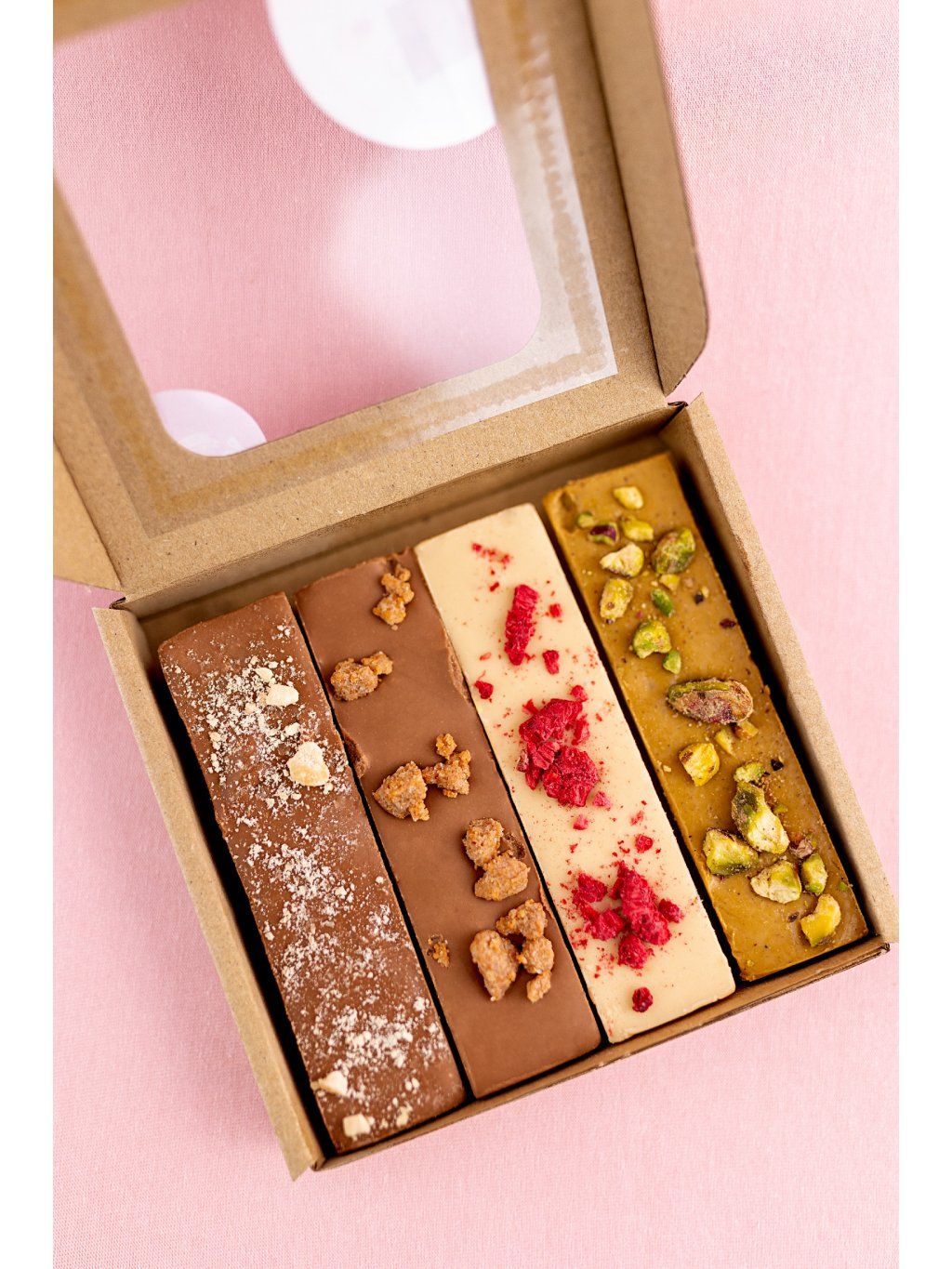 Bílý nugát s pistáciemi: Bílá čokoláda 40 % hm. (cukr, kakaové máslo, sušené plnotučné mléko, emulgátor: sójový lecitin, přírodní vanilkové aroma) ,100% pistáciová pasta, sekané pistácie