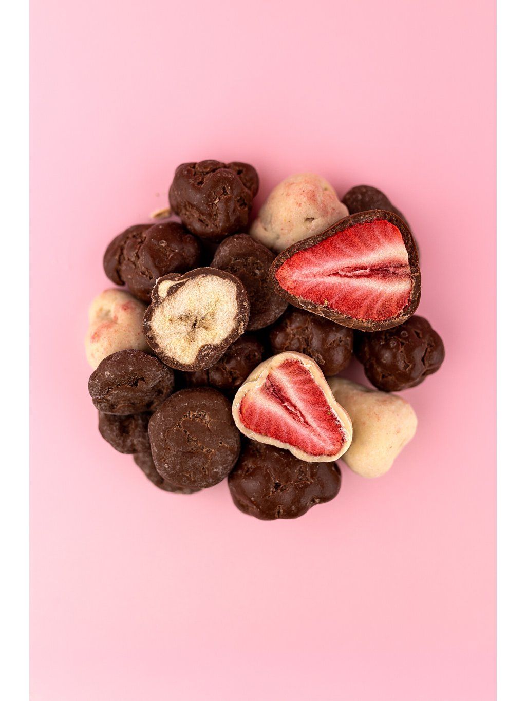Složení: 100% lyofilizované (mrazem sušené) jahody, lyofilizované banány, Bílá čokoláda (cukr, kakaové máslo, sušené plnotučné mléko, emulgátor: sójový lecitin, přírodní vanilkové aroma), Mléčná 34% čokoláda (cukr, mléko plnotučné, kakaové máslo, kakaová hmota, emulgátor: sójový lecitin, přírodní výtažek z vanilky. Obsah kakaové sušiny v mléčné čokoládě nejméně 34%.).