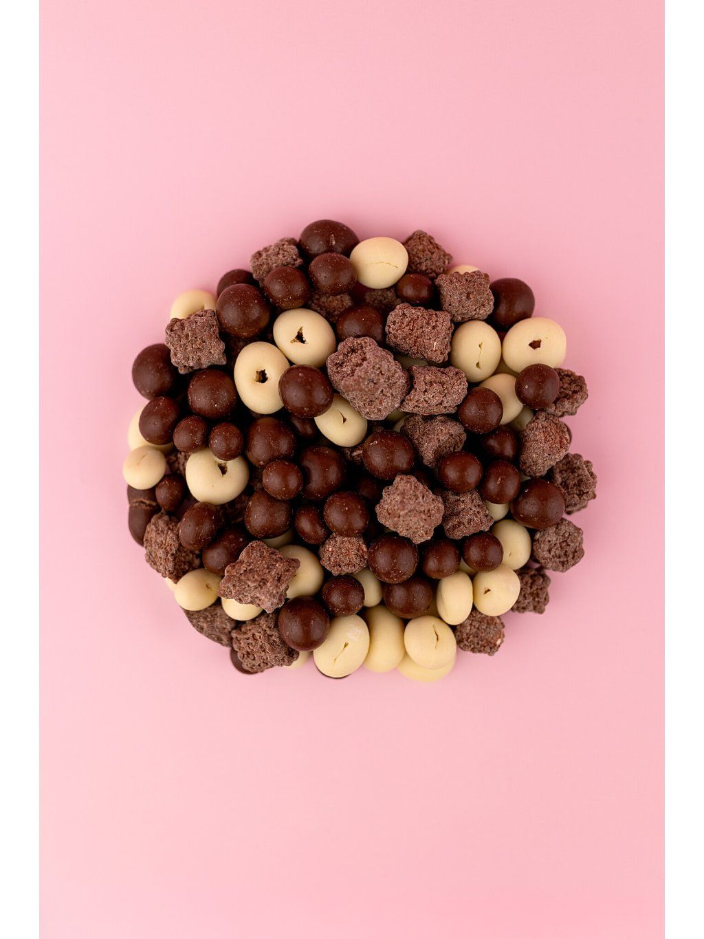 Složení čokoláda: Bílá čokoláda 40 % hm. (cukr, kakaové máslo, sušené plnotučné mléko, emulgátor: sójový lecitin, přírodní vanilkové aroma), mléčná 34% čokoláda (cukr, mléko plnotučné, kakaové máslo, kakaová hmota, emulgátor: sójový lecitin, přírodní výtažek z vanilky. Obsah kakaové sušiny v mléčné čokoládě nejméně 34%.), cereální kolečka s medem (cereální krupice 40% (kukuřice, rýže), pšeničná mouka celozrnná 31%, cukr, med 5%, glukóza, slunečnicový olej, sladový extrakt (z ječmene), emulgátor: lecitin (ze slunečnice), Cereální kuličky: kakaové (pšeničná mouka celozrnná 37%, kukuřičná krupice 28%, cukr, kakaový prášek se sníženým obsahem tuku 6%, glukóza, slunečnicový olej, sušené odstředěné mléko, emulgátor: lecitin (ze slunečnice), aroma, marshmallow 20% hm. (glukózovo - fruktózový sirup z pšenice* 64%, cukr 18%, voda 10%, vepřová želatina 3,5%, dextróza z pšenice* 2%, kukuřičný škrob 2%, vanilkové aroma <0,1%, barvivo E 162 <0,1%)