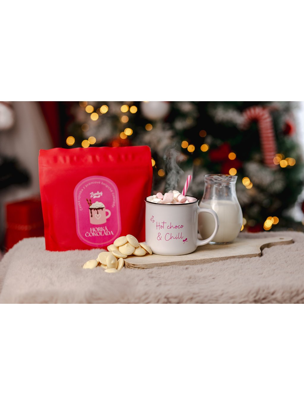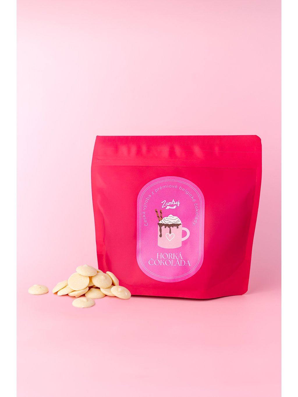 Roztomilý růžový sáček, ve které se ukrývá lahodná horká čokoláda. Dokonalá, sametová a navíc plná prémiové belgické čokolády.