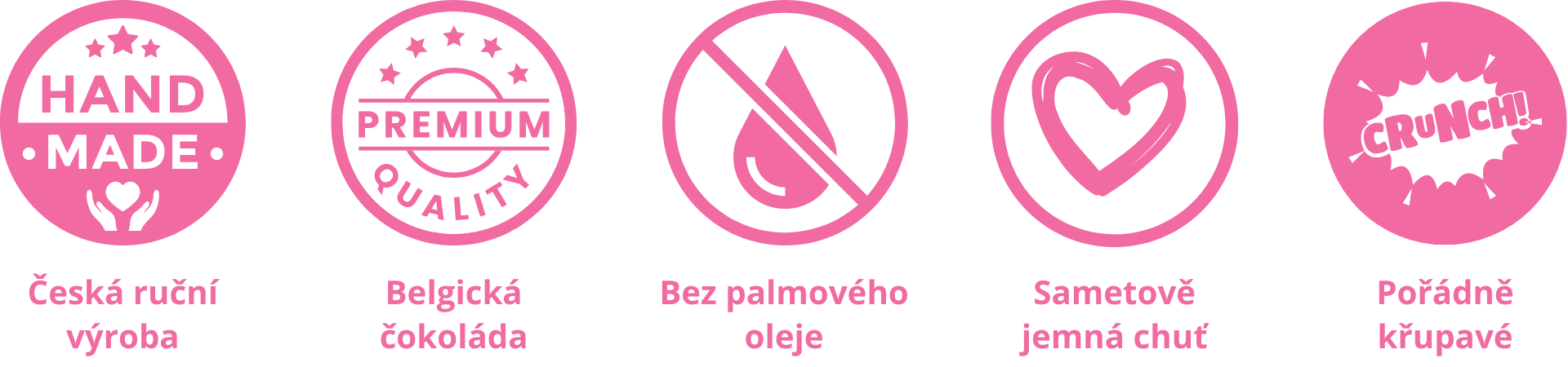 jsou vyrobené z prémiové belgické čokolády značky Belcolade a kvalitních oříšků. Více informací o použitých surovinách najdeš -ZDE-