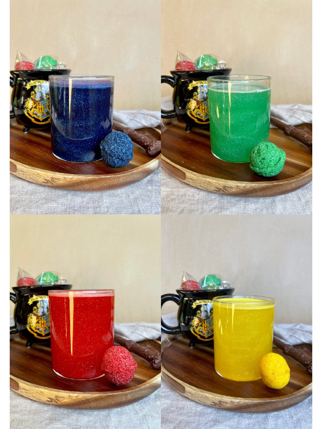 Konkrétně tyto příchutě Drinkových bomb: Nebelvír = Jahoda, Mrzimor = Jablko, Havraspár = Malina, Zmijozel = Meloun, Mnoholičný lektvar = Borůvka vanilka