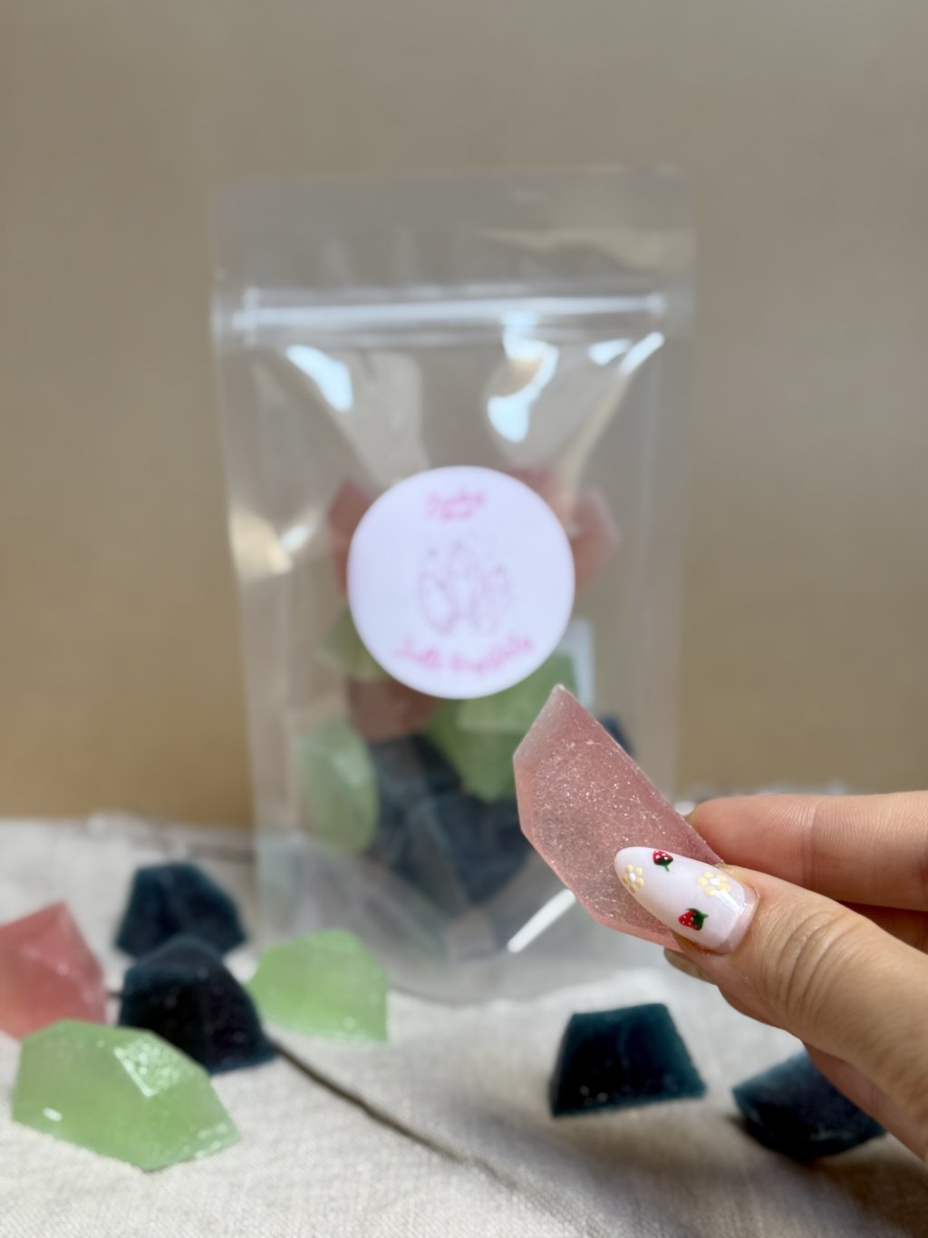 příchutě: Jahoda, Malina, Ananas kokos, Limetka máta, Mango, Liči, Meloun, Pomeranč limetka chilli, Brusinka limetka pomeranč, Broskev pomeranč brusinka. - 1 ks MIX - Jedlé krystaly - 100 g