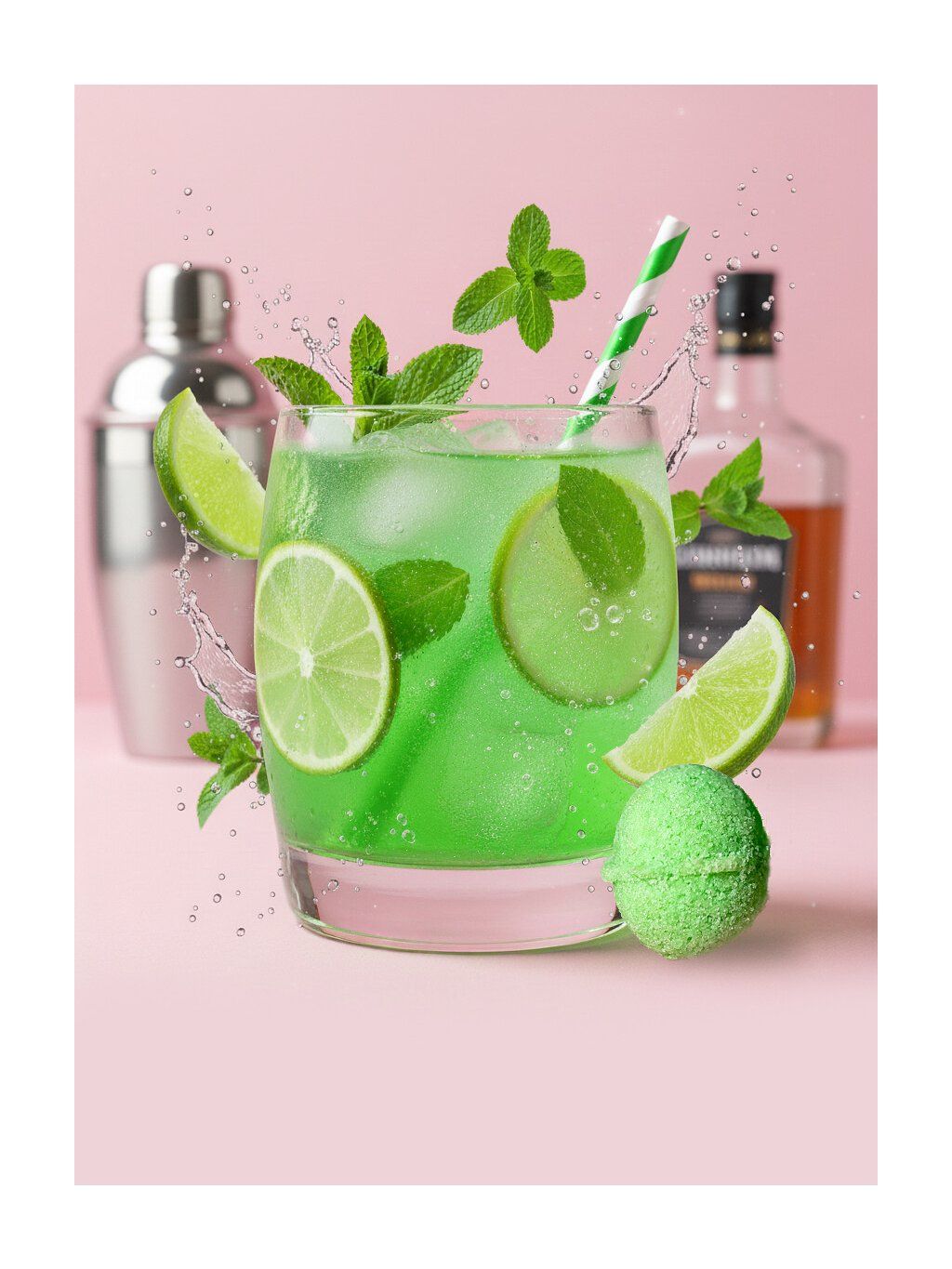 Složení Mojito: cukr, kyselina citronová, jedlá soda, limetkové a mátové aroma, sukralóza, třpytky: Hlinitokřemičitan draselný (E555), Oxidy a hydroxidy železa (E172), Oxid křemičitý (E551), barvivo: E102, 133*