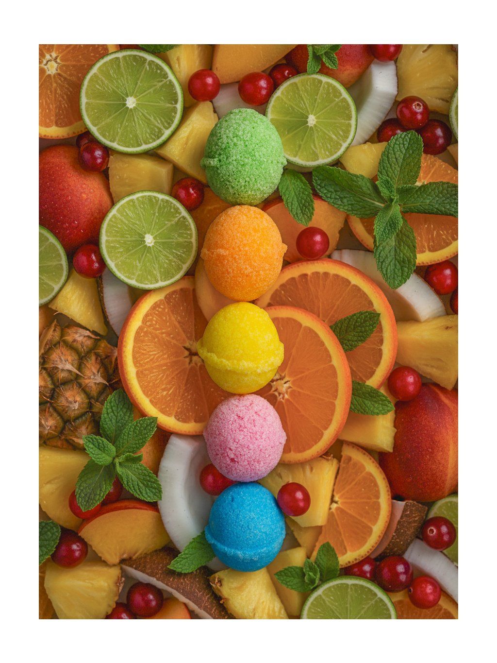 Složení Cosmopolitan: cukr, kyselina citronová, jedlá soda, pomerančové, limetkové a brusinkové aroma, sukralóza, třpytky: Hlinitokřemičitan draselný (E555), Oxidy a hydroxidy železa (E172), Oxid křemičitý (E551), barvivo: E124*