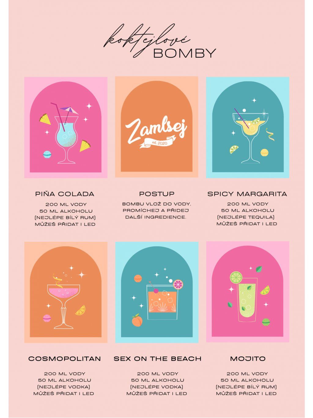 Nejen že si je můžeš připravit kdekoliv a kdykoliv, jelikož na ně potřebuješ jen 3 ingredience (voda, oblíbený alkohol a Koktejlová bomba). Ale navíc ani nemusíš mít nakoupené hromady sirupů a džusů, které využiješ jen párkrát. Protože vše se ukrývá v jedné malé roztomilé bombě.