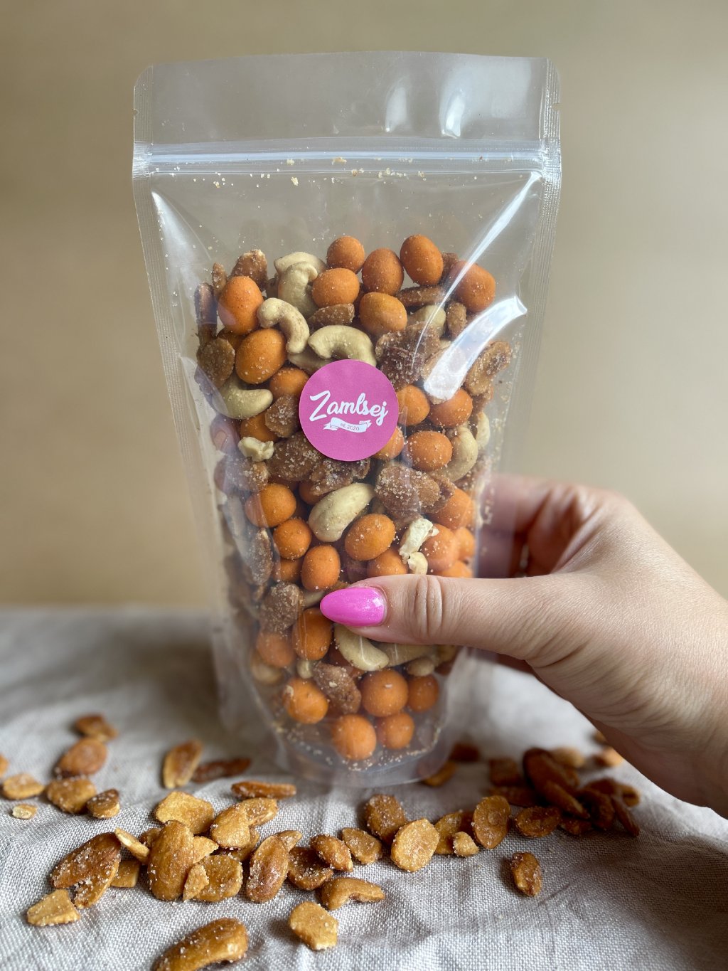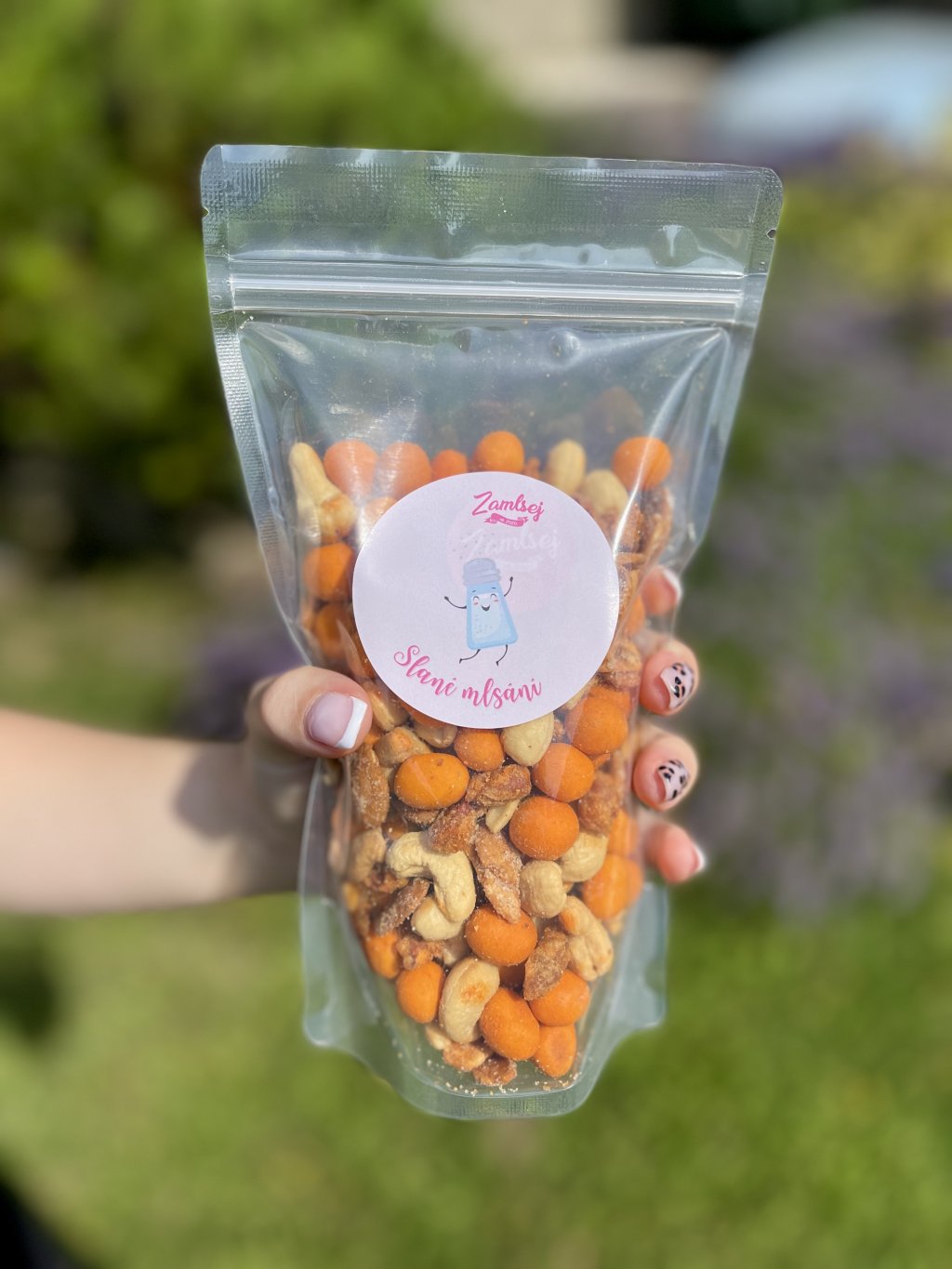 plné výborných arašídů v chilli těstíčku, uzených kešu a lahodných slaných mandlý v medu.