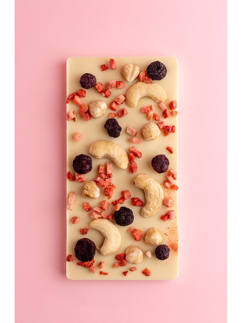 Složení Bílá čokoláda s dračím ovocem a jahody: Bílá čokoláda 40 % hm. (cukr, kakaové máslo, sušené plnotučné mléko, emulgátor: sójový lecitin, přírodní vanilkové aroma), kešu, lískové ořechy, lyofilizované borůvky a jahody.