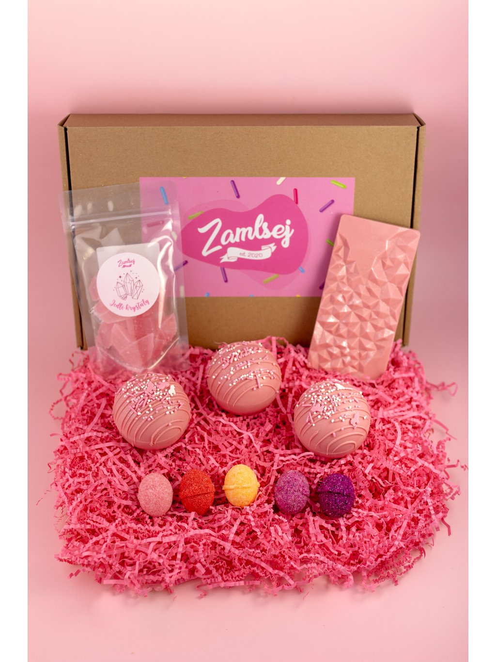 Sada je plná našich ČESKÝCH ručně vyráběných sladkostí, jako jsou jedinečné Drinkové bomby, lahodná čokoláda, ovocné Jedlé krystaly a vyhlášené Čoko bomby.