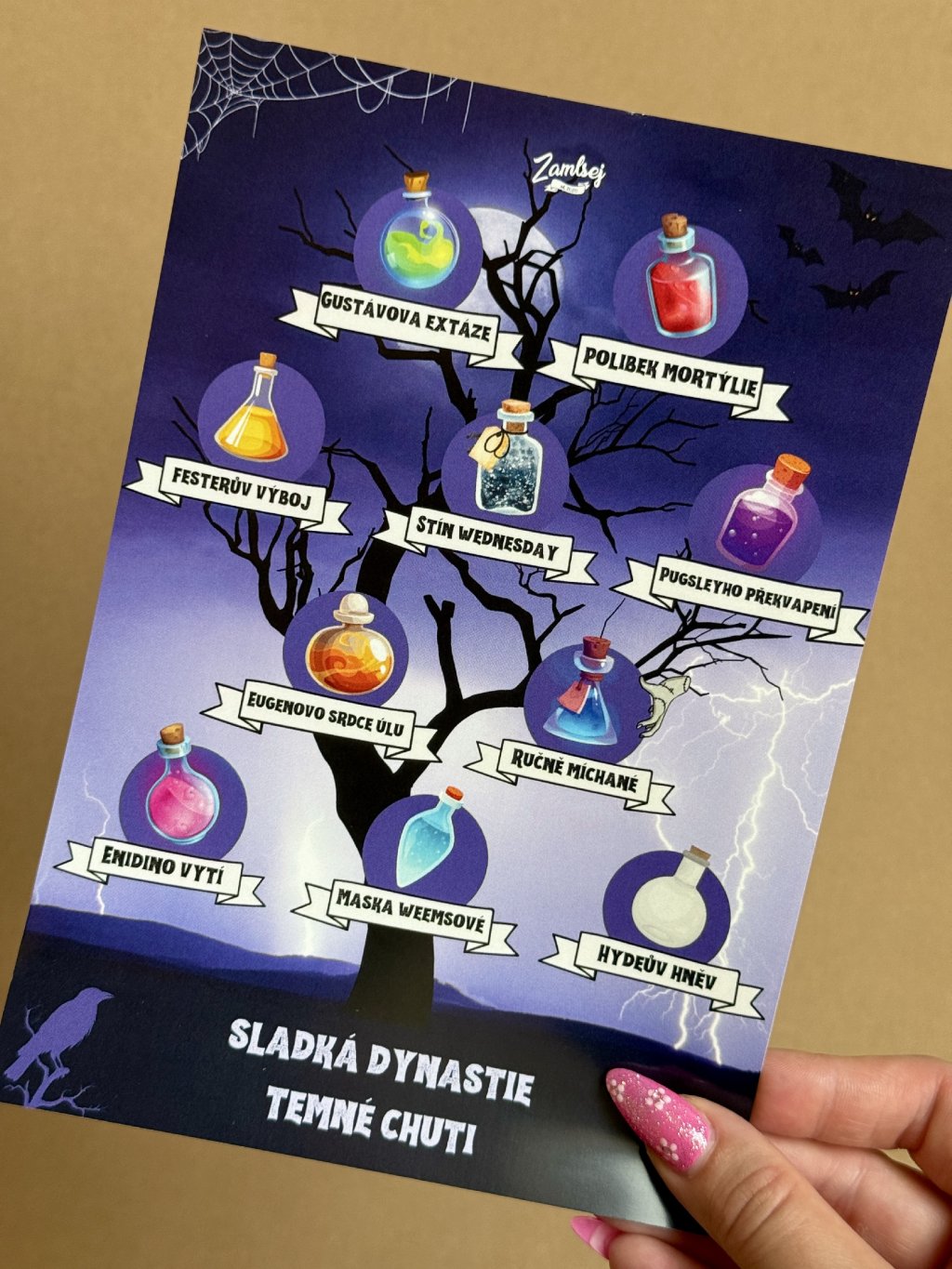 Navíc uvnitř najdeš i rodokmenovou kartičku, která ti prozradí, kterým členem této mírně děsivé rodiny je lektvar inspirovaný. 📜