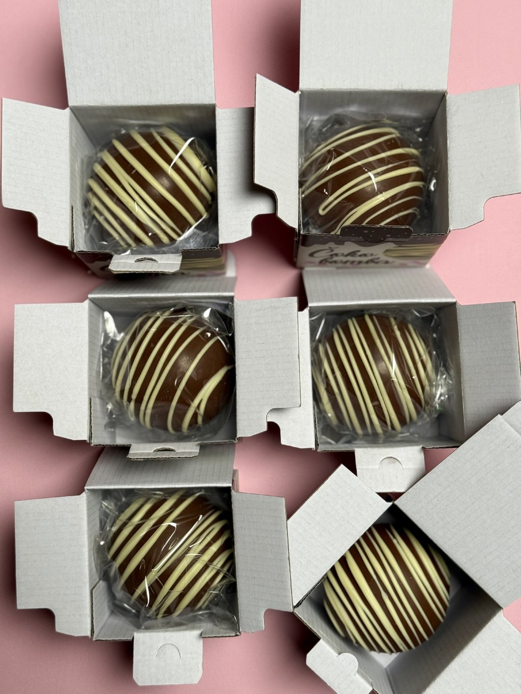 6 x 1 ks čokoládová bomba, zabalená v celofánovém sáčku a následně uložená v nádherné dárkové krabičce. Součástí krabičky je i návod na následnou přípravu horké čokolády.